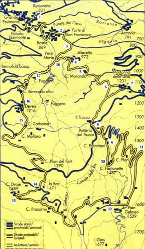Il percorso culturale forma un anello, con un tratto in comune; la partenza è a m. 821 e si sale fino a m.1500.