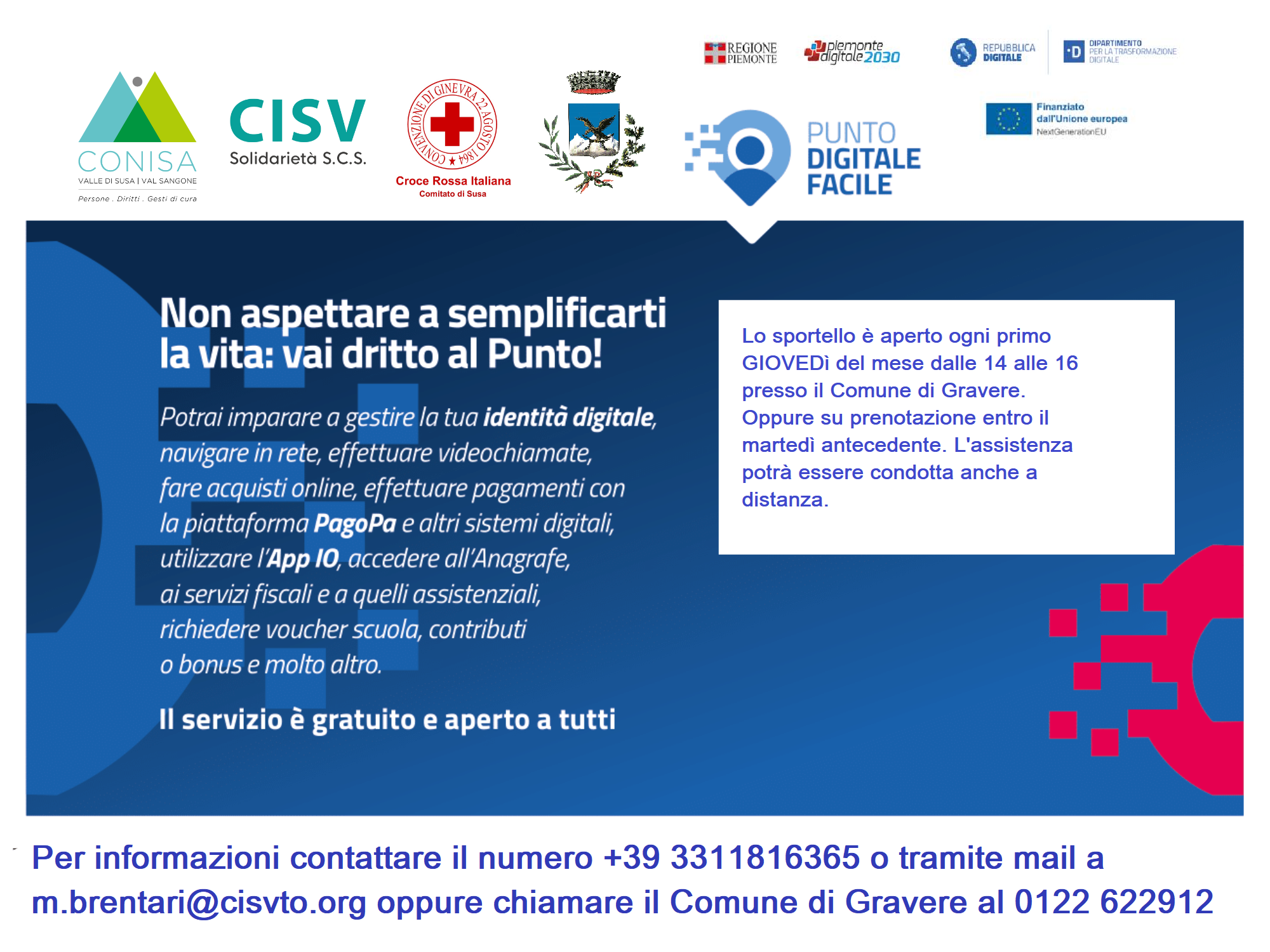 Il servizio è usufruibile ogni primo giovedì del mese dalle ore 14.00 alle ore 16.00 nella sala consiliare del Comune di Gravere mediante prenotazione.
